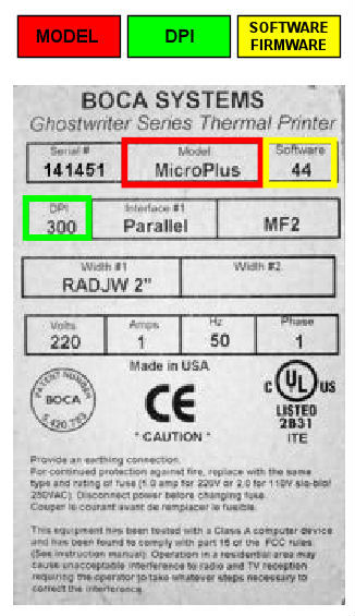 1. The label on the back or bottom of the printer will provide information regarding PRINTER MODEL, SOFTWARE (FIRMWARE) version, DPI, TICKET WIDTH, and INTERFACE.