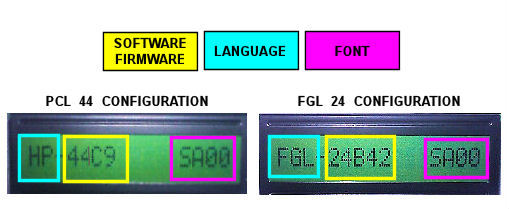 2. The printer digital display will provide information regarding the LANGUAGE (FGL or PCL/HP), SOFTWARE (FIRMWARE) version, and installed font version.