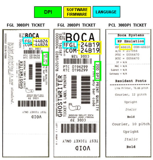 3. A printer test ticket will provide information regarding the LANGUAGE (FGL or PCL/HP), SOFTWARE (FIRMWARE) version, and DPI.
